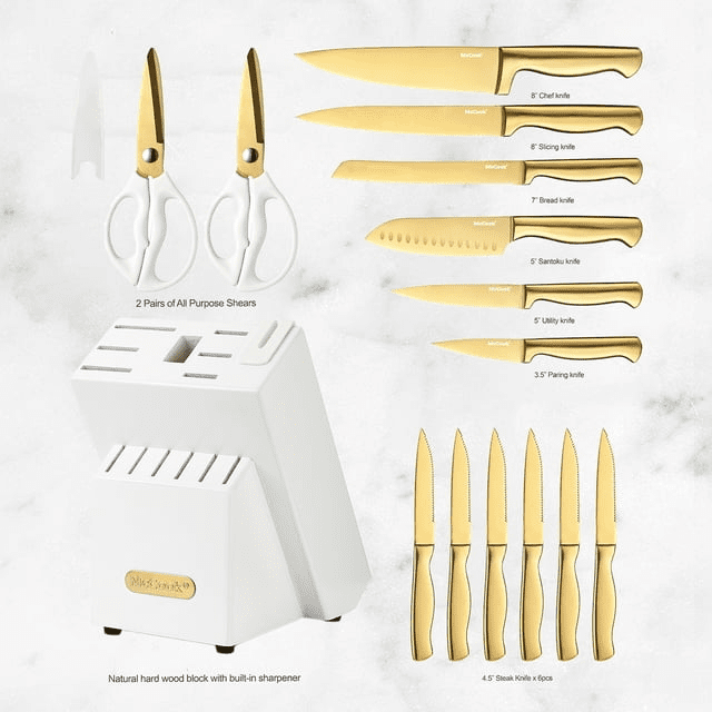 The mccook mc21g 15-piece knife set features titanium coated rust-resistant golden knives and white wash finish wood block with built-in sharpener.